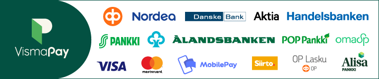 Verkkokaupan maksuvälittäjänä toimii Visma Pay (Paybyway Oy, y-tunnus 2486559-4), joka on rekisteröity Finanssivalvonnan ylläpitämään maksulaitosrekisteriin. Maksamiseen siirrytään Visman verkkopalvelun kautta ja tiliotteella ja laskulla maksun saajana näkyy Visma tai Paybyway Oy.
