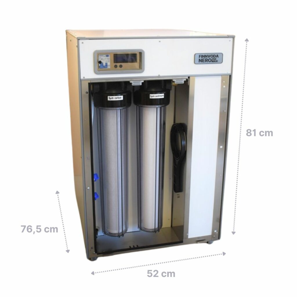 NERO 250 MAXI käänteisosmoosilaite on suunniteltu omakotitaloille, kesämökeille ja vapaa-ajan asunnoille osa- sekä ympärivuotiseen käyttöön. Laite sijoitetaan vesilaitteille soveltuvaan tilaan, jossa kondenssi- tai mahdollinen vuoto ei voi aiheuttaa vahinkoa. Laite tulee sijoittaa säältä suojaan. Tyypillisesti laite löytää paikkansa teknisestä tilasta, terassilta, laitetta varten talon kylkeen tai lähettyville rakennetusta eristetystä kopista. Laitteen verrattaen matalan käyntiäänen johdosta sitä ei kuitenkaan suositella makuutilojen läheisyyteen, vaikka laitteen voikin kytkeä yöksi pois päältä jakelun häiriintymättä. Laite valmistaa vettä myös kulutuksen aikana ja siksi omalla sisäisellä 60 litran säiliöllä käytettäessä järjestelmä palvelee erinomaisesti täysin varustellulla omakotitalolla tai vapaa-ajan asunnolla kaikkia tarpeita 1-2 henkilön käytössä, myös suihkun osalta. Mikäli vettä halutaan käyttää runsaasti, voi järjestelmän varustaa hankintahetkellä tai jälkikäteen 120 L lisäsäiliöllä, jolloin puskuri riittää jo isommallekin henkilömäärälle täysin varustellulla omakotitalolla.